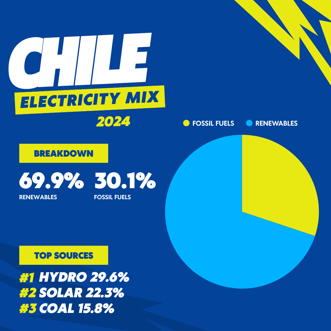 Fossil fuels supplied 30.1% of Chile’s electricity in 2024. Coal made up 15.8%, natural gas 11.6%, and other fossil sources 2.7%.