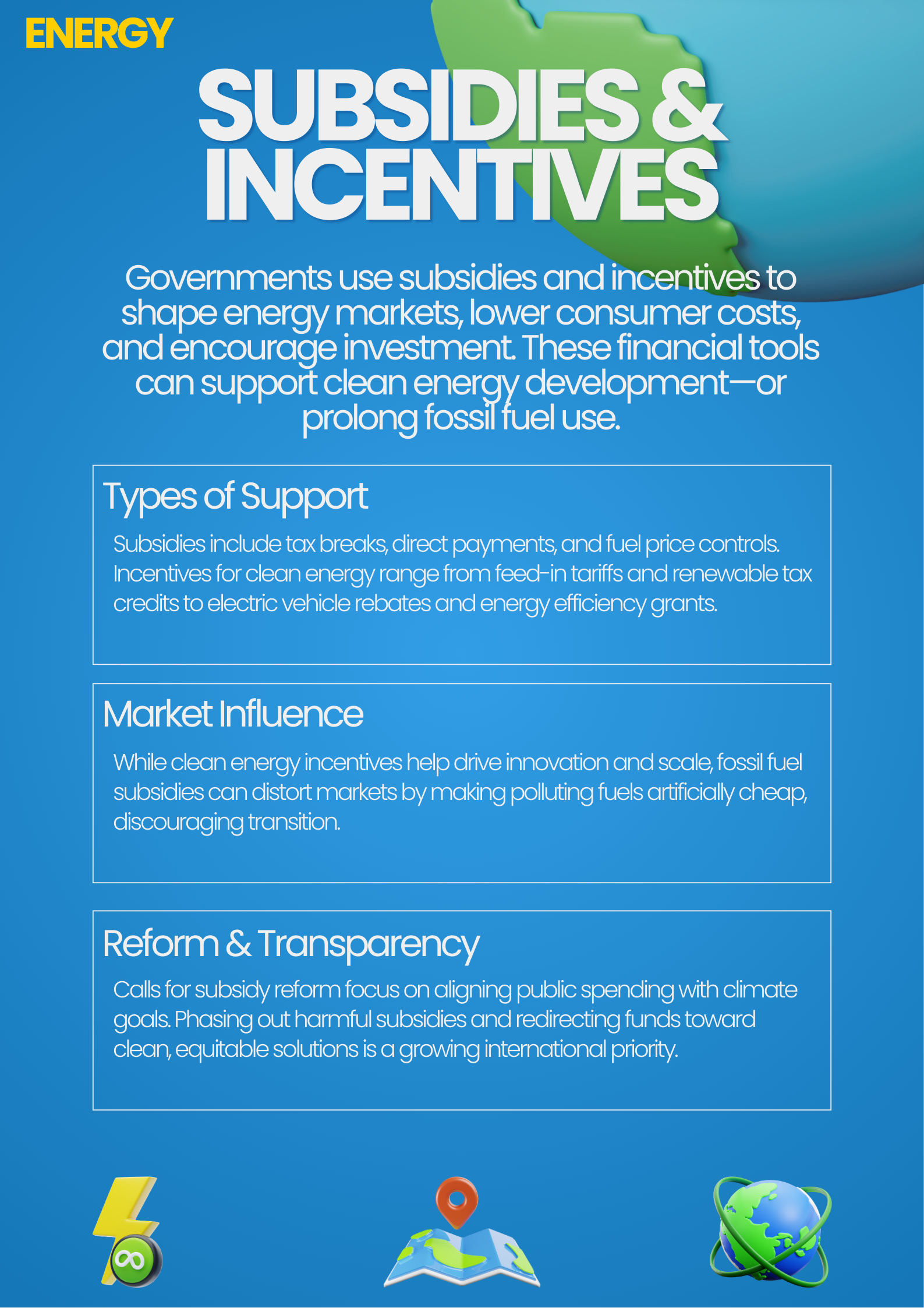 Governments use subsidies and incentives to shape energy markets, lower consumer costs, and encourage investment. These financial tools can support clean energy developmentāor prolong fossil fuel use.