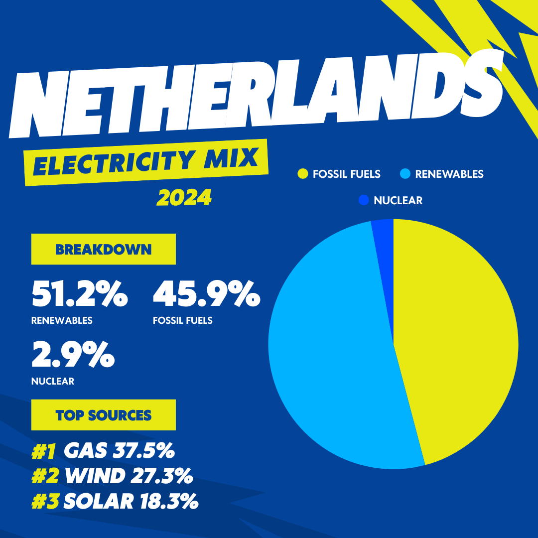 Fossil fuels supplied 45.9% of the Netherlands’ electricity. Natural gas provided 35.7%, coal 6.84%, and other fossil sources 3.36%.